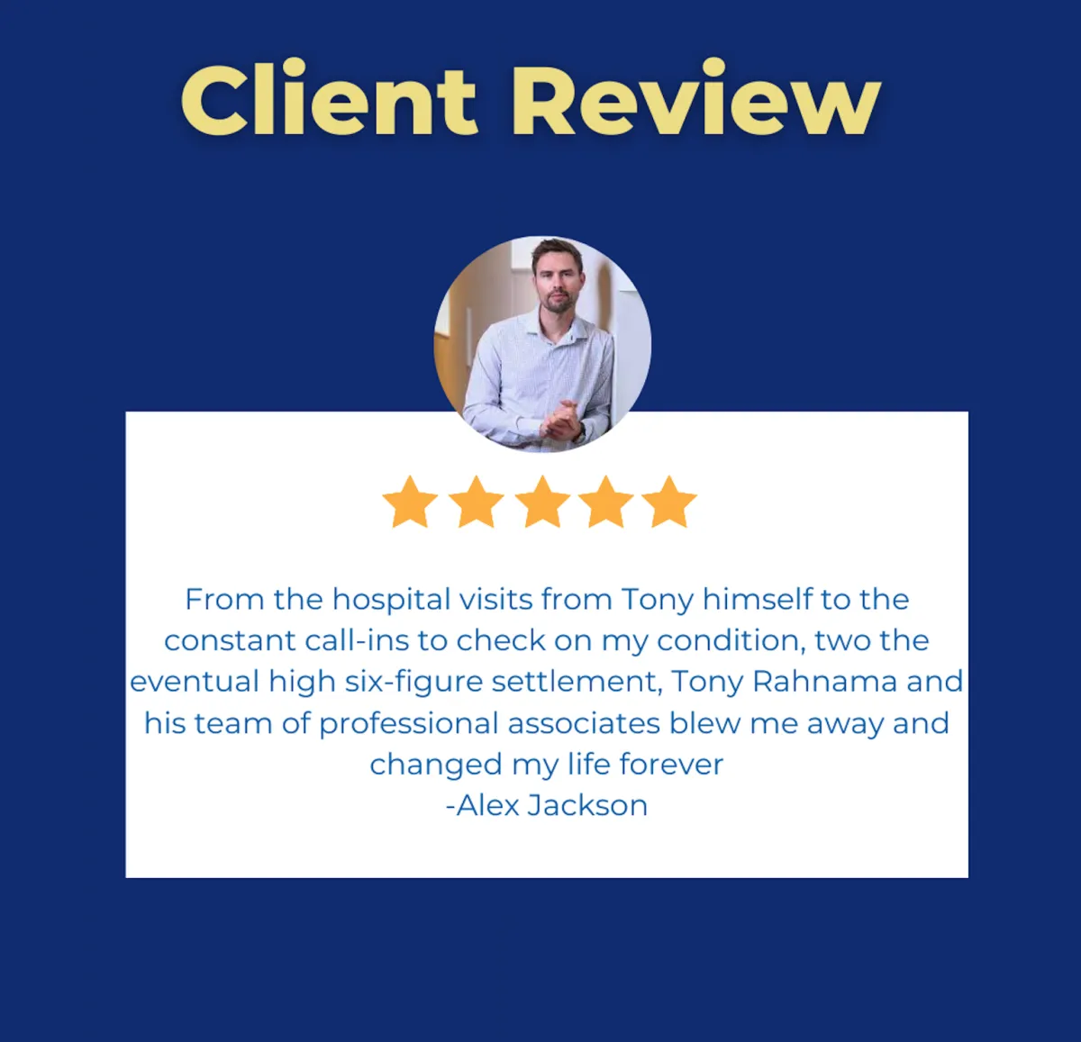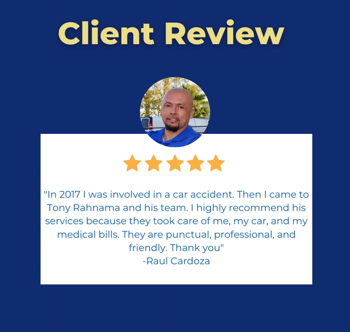 My experience with Tony and Rahnama Law has been extremely helpful and always there to answer any questions I have ! Thank you to these wonderful people for helping me when I didn’t know what steps to take they walked me through . THANK YOU!!